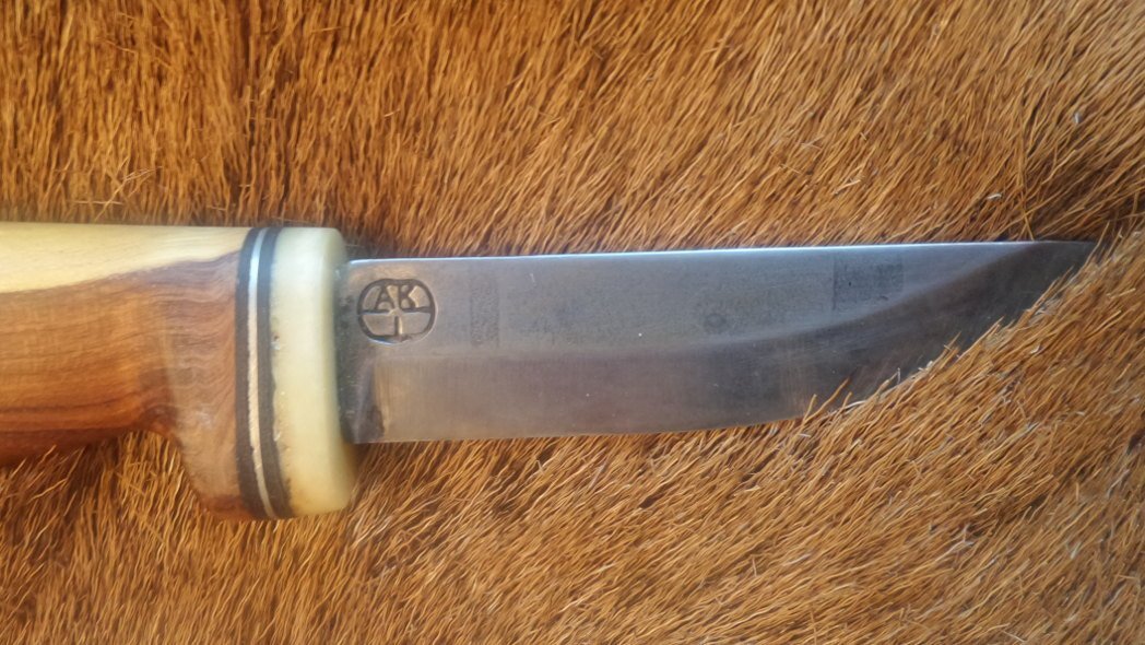 Dieses handgemachte Messer kommt mit einer rustikalen ungeschliffenen Klinge aus Uddeholm-Kohlenstoffstahl daher. Die Klinge dieses kurzen Finndolches stammt aus der Schmiede Kankaapää, ist ca. 8cm lang, 2cm breit und ca. 3,5mm stark. Der Griff ist aus Kamelknochen, Elchleder und Goldregenholz und ca. 12cm lang. Das Messer steckt in einer Messerscheide aus Rindleder. Die Kosten für dieses Messer betragen 79,- € zzgl. Verpackung und Versand.